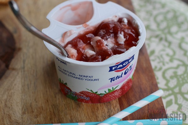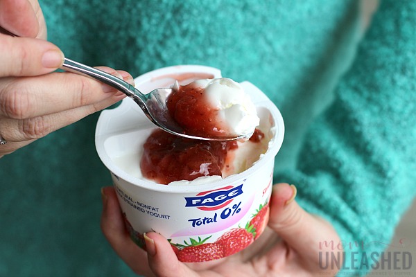While FAGE Total 0% Split Cups are my go-to right now, with the strawberry variety admittedly being my favorite, I’ve learned from years of experience that variety is the spice of life and so often, temptation to make choices that don’t fit in with my healthy lifestyle comes from boredom. That’s why I make it a goal of mine to have a handful of breakfast, lunch and snack ideas always on hand (try sticking them on the front of the fridge) and I adore that FAGE Total Split Cups fit in perfectly with all of them! The all-natural Greek strained yogurt comes with a variety of delicious fruit toppings! Here are just a few of my favorite ideas to get you started!