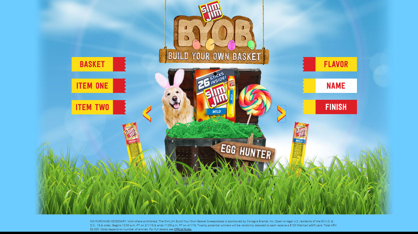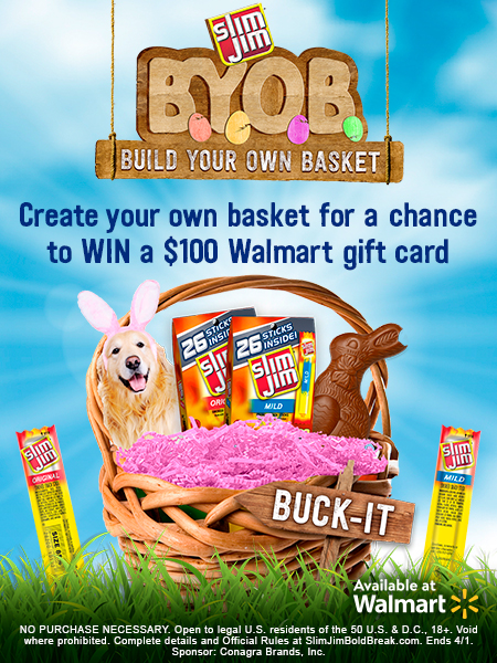 *NO PURCHASE NECESSARY. Void where prohibited. The Slim Jim Build Your Own Basket Sweepstakes is sponsored by Conagra Brands, Inc. Open to legal U.S. residents of the 50 U.S. & D.C., 18 & older. Begins 12:00 a.m. PT on 3/1/18 & ends 11:59 p.m. PT on 4/1/18. Twenty potential winners will be randomly selected to each receive a $100 Walmart eGift card. Total ARV: $2,000. Odds depend on number of entries. For full details see official rules at SlimJimBoldBreak.com.