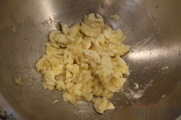 These Peanut Butter and Banana Pupcakes are quick and easy and trust me when I say that they make special moments with your pup delicious! To start, I mashed up my banana in the bottom of a mixing bowl.