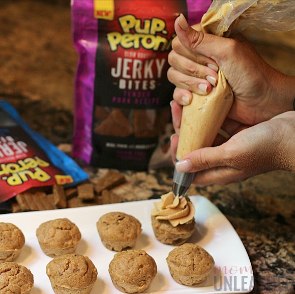 Now, this is where things got really fun for my Ollie! I knew he would like my creation but I wanted him to love it so I decided to top each of my Peanut Butter and Banana Pupcakes with his favorite Pup-Peroni Jerky Bites. I had picked up both the pork and beef varieties on my last trip to Walmart and I knew from our everyday interactions that these tender jerky bites with big meaty flavor were a way to take my pupcakes to Ollie worthy level! After opening my bags of new Pup-Peroni Jerky Bites, I quickly and easily tore them into smaller pieces that were the right size for my small pupcakes. Then I simply placed one piece of Pup-Peroni Jerky Bites into each of my Peanut Butter and Banana Pupcakes, pushing it down into the top to secure it.