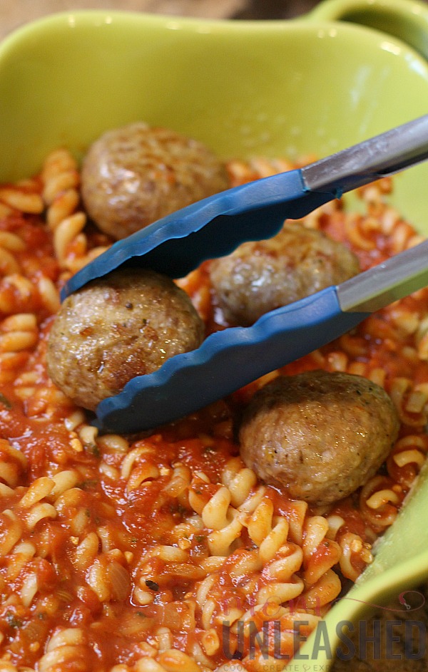 After spooning the remainder of my pasta over my layer of meatballs, I added my remaining Carando meatballs to the top of my pasta dish, gently pushing them down into the pasta to keep them nestled perfectly in place.