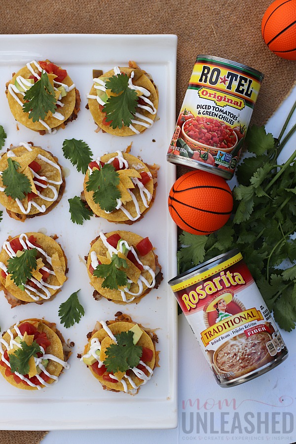 If you think I’m crazy about football season, you haven’t seen me during the March basketball playoffs yet. Once it’s time to set the basketball brackets, my most awesome snacks come out. Not only am I a super mega-basketball fan (we do have some pretty amazing teams in my home state) but my teenager eats, sleeps and breathes basketball and that’s never more true that it is during the month of March. In additional to my home being filled with family and neighbors, there’s always an endless stream of teenagers wandering in, watching the next match up, grabbing some food and then heading on their way. For that reason, it’s been super important for me to come up with the ultimate game time snack. I tried my hand at chips and dip (truthfully, it got a little messy ya’ll). I tested out tacos (it was good but missing the wow factor). But when I whipped up my now essential game day Mini Mexican Pizzas using RO*TEL Original Diced Tomatoes and Green Chilies and Rosarita Traditional Refried Beans, I immediately knew that I had discovered the perfect game day snack for all the March basketball match ups.