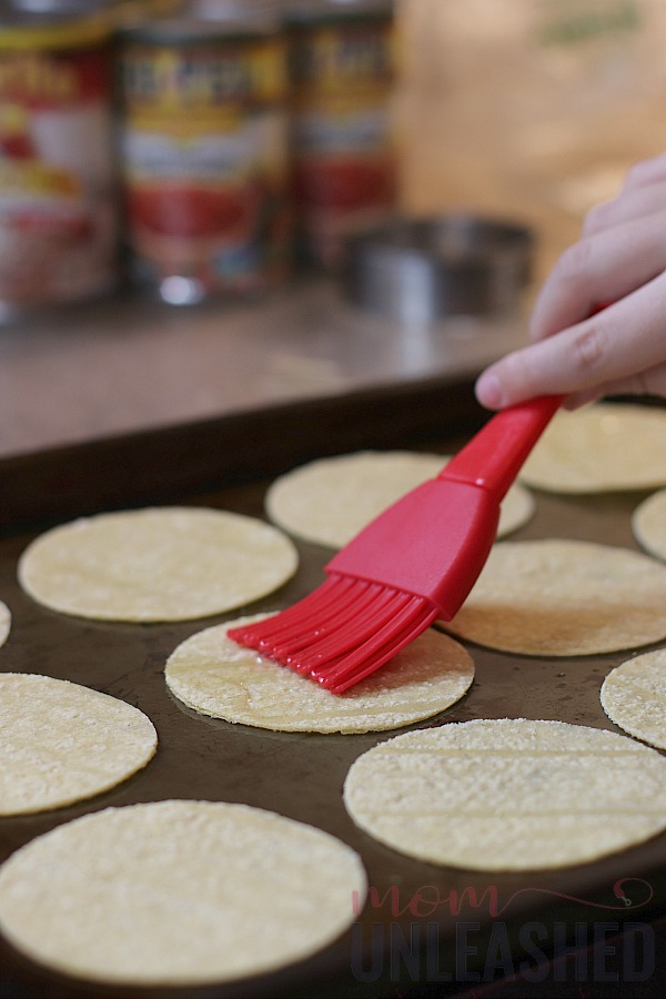 While my meat was cooking, I used a small round cookie cutter to cut circles out of my corn tortilla shells. Once I had 24 circles cut out, I brushed them with olive oil and cooked them at 400 degrees for about 2-3 minutes until they were perfectly crispy.