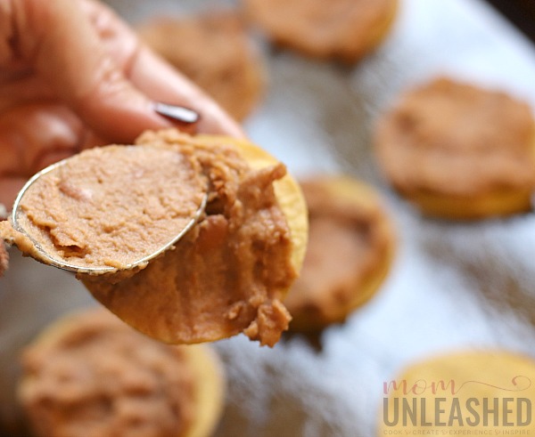 With all my prep work done (see, I told you this was an easy recipe), all that was left to do was assemble my Mini Mexican Pizzas. To do this I heated my Rosarita Traditional Refried Beans in a medium saucepan on my stove top and then added one tablespoon of the warm refried beans to 12 of my tortilla circles.