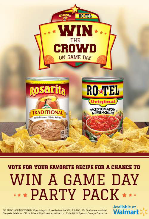 So what could you win? The prize pack includes a $100 Walmart eGift Card, 2 cans of RO*TEL Tomatoes, 2 cans of Rosarita Refried Beans, a Mini Muffin Pan, Table Runner, Serving Platter and condiment set. That means you can whip up your own March basketball game day snack with this awesome prize*.