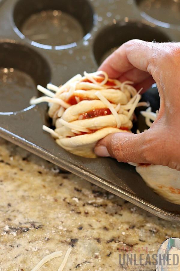 We then turned the stack of dough and pizza goodness on it’s side and added one stack to each of our greased muffin tins.
