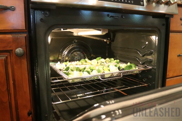 I have to tell you though, Flametta is so much more than just a range….which brings me to hack one, choose a range that does more than just cooks. You see, while Falmetta may look like your regular stove, she’s actually a Frigidaire range that works harder and does more. In addition to being a gas range (and don’t worry, her cousins come in Electric and Induction options too!), she has air fry built in. I’ll tell you more about that shortly but just imagine not having to pull out a separate air fryer every time you want air fried food. It’s life changing….seriously life changing. How you ask? Well, it’s no secret that I love air fried foods. Which brings me to hack number two, air fry meats and veggies for a crispy, healthier version of some of your favorite meals. Now, I’ve been “trying” to do this for some time but truthfully, I just don’t have enough counter space to keep an air fryer in my kitchen. And, if I’m being honest, I’m often too lazy to drag that big, bulky air fryer out and set it up. But now, I’ve got the best of both worlds because Frigidaire’s Gallery 30” Front Control Gas Range with Air Fry lets me perfectly air fry foods IN MY RANGE (mind blown). Even better, with a much larger capacity that air fryers, I can air fry entire meals for my family with ease and get crispy, delicious dishes using little or no oil. Want to see how I do it? Let’s talk one pan air fry meals for a minute why don’t we as I share the first of my three easy air fry recipes.