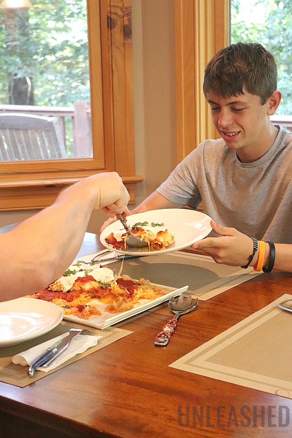 By combining the bake feature for the spaghetti squash (and did I mention that this stove even has a quick preheat function for when I’m in a hurry?), the Air Fry feature for the chicken and the fast boil feature for the sauce, I can seriously cook this meal so quickly and easily simply by switching back and forth and allow my stove that does it all to truly do it all! In the end, my family is rewarded with a lower-carb, healthier version of a family favorite that they like more than the original.