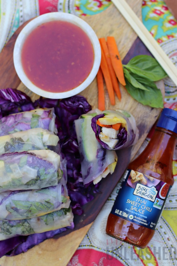 After repeating this process and filling all of my Blue Dragon Spring Roll Wrappers with grilled chicken and veggies, I slice a little more of my purple cabbage and add it to a serving plate, placing my spring rolls on top. Then the only thing left to do is pair my Grilled Chicken and Veggie Spring Rolls with the perfect dipping sauce. Thankfully Blue Dragon has me covered there as well with their Thai Sweet Chili Sauce.