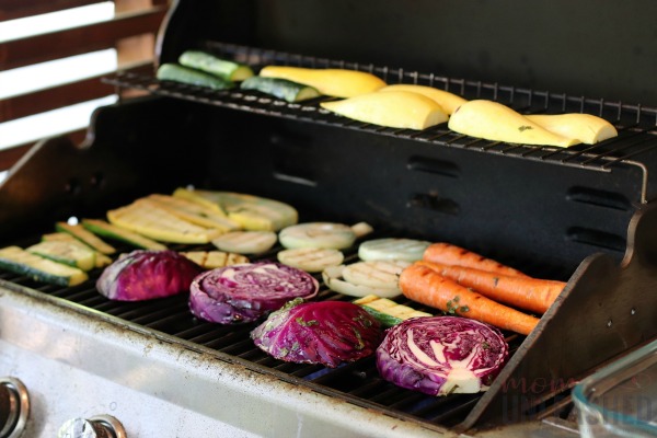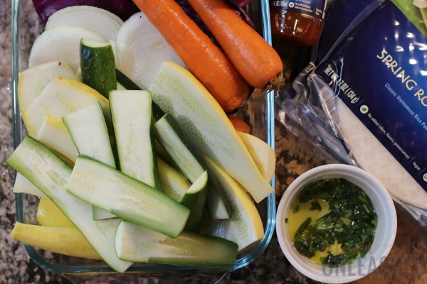 For my family, the beauty of spring rolls are that you can add pretty much anything to the inside of them. Have leftover veggies? That works! Did you cook too much chicken or shrimp last night? Turn it into spring rolls. The sky is really the limit when it comes to creating your signature spring roll creation. Mine just happens to be Grilled Chicken and Veggie Spring Rolls because, well, that’s what my family eats quite often. Every weekend we grill a big batch of chicken and veggies so that we can use them during the week and combined they are seriously the perfect filling for my grilled chicken and veggie spring rolls. Just in case you don’t already have grilled chicken and veggies in your refrigerator, let’s start with step one and grill up some veggies and chicken. I get my hubby to grill literally all the things so all I really have to do is chop, marinate and hand off the food.