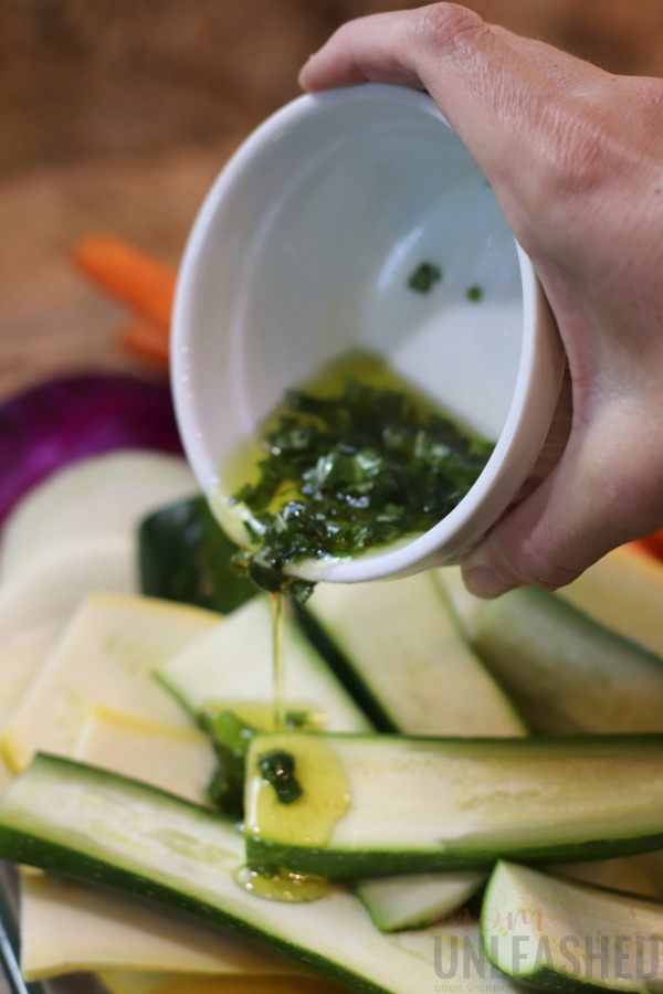 I like to use a simple marinade on my chicken and veggies that incorporates fresh herbs, so I start by chopping up some fresh basil and mixing it together with olive oil, minced garlic and lemon. Then I simply pour my marinade over the top of my veggies and chicken and let the hubby do what he does, grilling it to perfection.