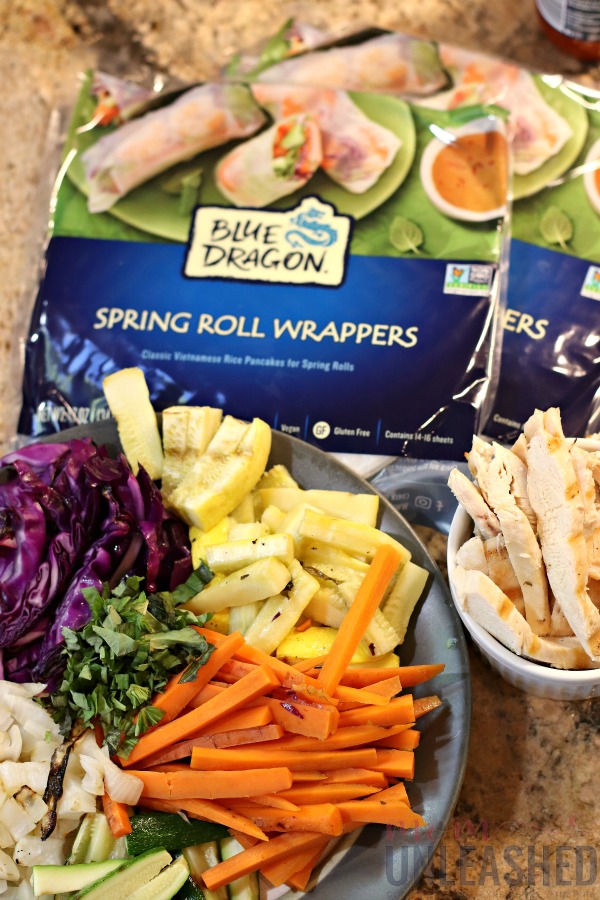 So now that I’ve shared where to purchase your own Blue Dragon products (remember, Harris Teeter’s International Foods Aisle or Asian Aisle is where you want to be!), let me show you how I used these vegan, gluten free, Non-GMO spring roll wrappers that have no added colors, flavors or preservatives to create a simple yet delicious meal that’s full of crisply grilled veggies paired with perfectly cooked chicken!