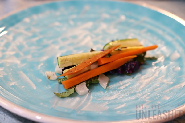 Once I pull my Blue Dragon Spring Roll Wrapper out of the warm water, I gently pat any excess water off each side with a paper towel and then put it on a plate. This is where things really get fun. To create my Grilled Chicken and Veggie Spring Rolls, I layer on all of my fillings, starting with my fresh basil and topping it with onions, cabbage, zucchini, squash and carrots. I have found the most success by creating my stack of ingredients on the bottom third of the spring roll wrapper. After adding a few slices of chicken to the top of my veggies, it’s time to roll, baby roll!
