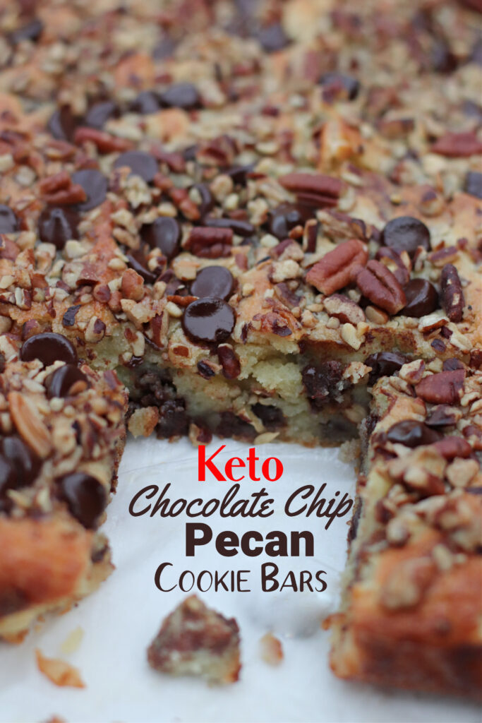 I hope you’ll give this easy recipe for Keto Chocolate Chip Pecan Cookie Bars a try and let me know what you think of them in the comments below!