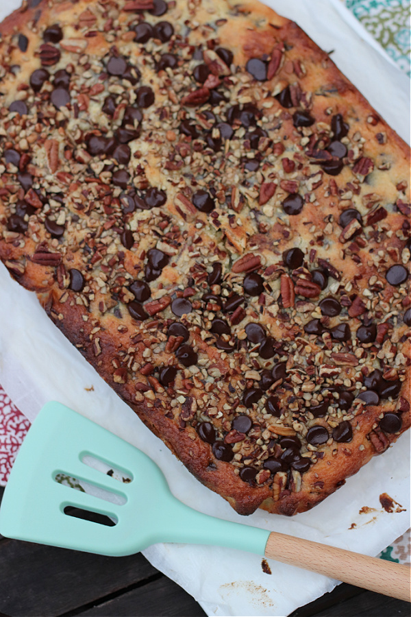 For an extra bit of sweetness and crunch, I sprinkled a few more sugar-free chocolate ships and pecan pieces over the top and pushed them down into the batter.