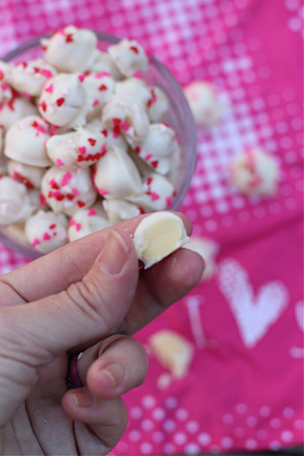 - Sprinkle the top of the white chocolate covered macadamia nuts with Valentine's sprinkles.