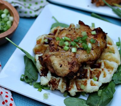 Crispy Pan Fried Chicken Thighs with Mashed Potato Waffles